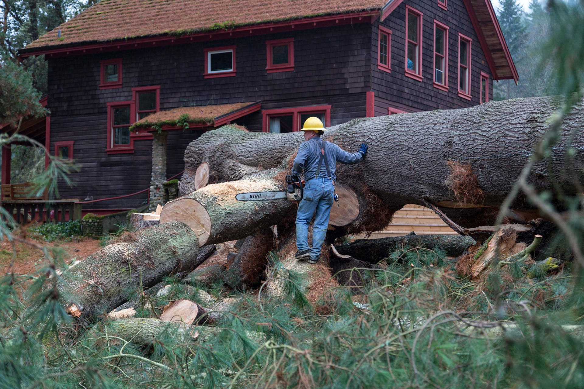 The photo on the right shows the pine tree shortly before it was taken down. If you look carefully, about halfway up the main trunk, you should be able to see a slightly orange section where a secondary trunk had broken off during a storm not long before. This damage foretold a future vulnerability for the adjacent farm house, which houses visitors to the institute.