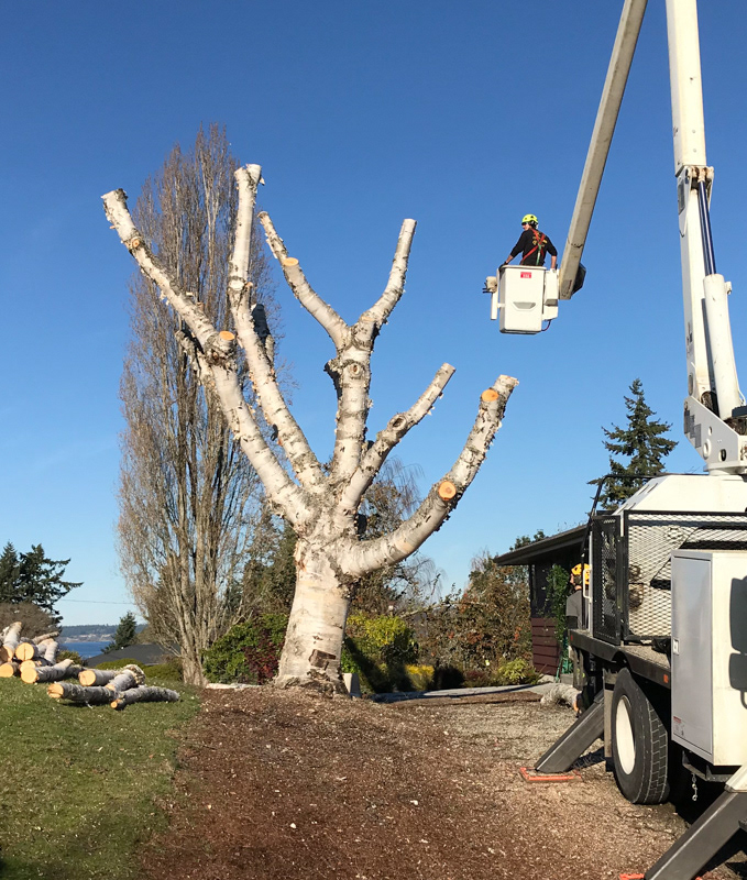 The owners of a property in Langley were advised that their Birch tree was degrading and posed a danger to their house. Because some of the limbs were protruding over the roof of the house, the use of a cherry-picker truck was advised. The photo on the right shows the tree at the stage where the arborists had removed all of the upper trunk/limbs.